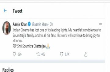 "Indian Cinema has lost one of its leading lights. My heartfelt condolences to Soumitraji's family, and to all his fans. His work will continue to bring joy to all of us. RIP Shri Soumitra Chatterjee," Aamir wrote.
