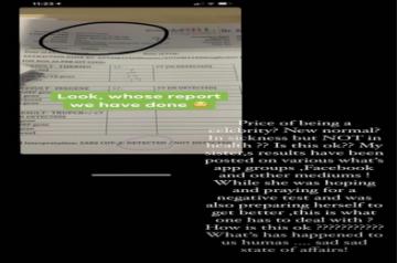 "Price of being a celebrity? New normal? In sickness but not in health?? Is this ok?? My sister's results have been posted on various WhatsApp groups, Facebook and other mediums! While she was hoping and praying for a negative test and was also preparing herself to get better, this is what one has to deal with? How is this ok????????? What's has happened to us humans … sad sad state of affairs," she wrote on Instagram Stories while sharing an image of the report, which has been leaked online.