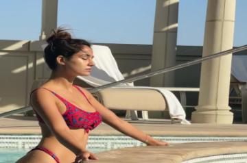 Mumbai, Feb 16 (IANS) Bollywood actress and fitness enthusiast Disha Patani set the mercury soaring on Tuesday with her latest picture of a cool dip in the pool, clad in dark pink bikini.
