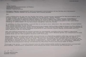 The letter reads: "Sir, I am writing this to you as my family has been continuously harassed by journalists and media people in relation to the death of my daughter Disha Salian. In light of the above unfortunate incident and circumstances, I had already submitted a written complaint in Malvani Police Station & ACP's office vide letter dated: 13/07/2020 against derogatory posts and forwards being shared by the listed people in the said letter, leading to defamation of my deceased daughter and my family."
