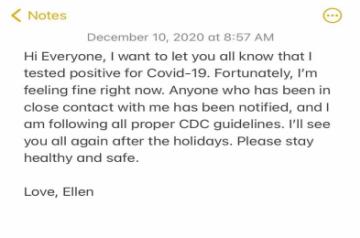 "I'll see you all again after the holidays. Please stay healthy and safe. Love, Ellen," she added.