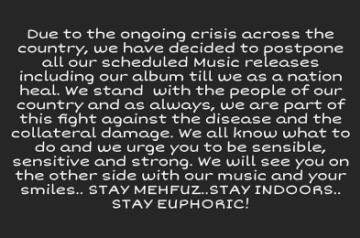 The statement reads: "Due to the ongoing crisis across the country, we have decided to postpone all our scheduled music releases including our album till we as a nation heal. We stand with the people of our country and as always, we are part of this fight against the disease and the collateral damage. We all know what to do and we urge you to be sensible, sensitive and strong. We will see you on the other side with our music and your smiles.. stay mehfuz, stay indoors, stay euphoric."