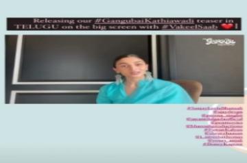 Mumbai, April 8 (IANS) Actress Alia Bhatt announced on Thursday the Telugu teaser of her film "Gangubai Kathiawadi" will be attached with Telugu star Pawan Kalyan's upcoming theatrical release, "Vakeel Saab".