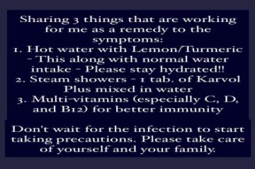 He also shared three home remedies that are working for him. He wrote: "Sharing three things that are working for me as a remedy to the symptoms: First, hot water with lemon/turmeric - this along with normal water intake - please stay hydrated. Second, steam showers with one tab of Karvol Plus mixed in water. Third, multi-vitamins (especially C, D, and B12) for better immunity."