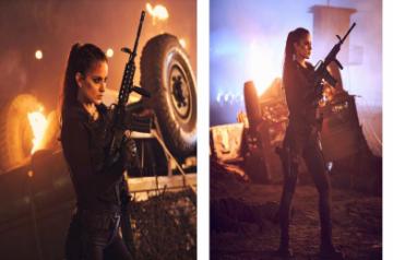 Kangana posted the look on Instagram. The image seems to capture an action sequence what with a burning car visible in the backdrop. The actress is armed with a machine gun and a pistol.