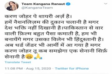 "Karan Johar ke liye shayari arz hai...Humein nationalism ki dukaan chalani hai par deshbhakti nahi dikhani hai. Pakistan se war wali filmein bahut paise kamati hain, Hum bhi banaenge lekin uska villain bhi Hindustani hai. Ab third gender bhi aa gaya army mein lekin Karan Johar tu kab samjhega ek senani sirf senani hai. (A poem for Karan Johar...we want to jump aboard the nationalism bandwagon but won't show patriotism. Films based on war with Pakistan earn money so we will make such films but the villains in these will still be Indian. Now the third gender has also entered the army, when will you understand, Karan Johar, that a soldier is simply a soldier?)," read a tweet posted by Kangana's team.