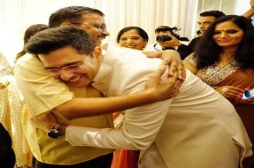 New Delhi, May 14 (IANS) Raghav Chadha's political mentor, Delhi Chief Minister Arvind Kejriwal, took to social media to post pictures of his young associate and Rajya Sabha MP with his fiancee Parineeti Chopra from their engagement ceremony that took place on Saturday evening at Kapurthala House in New Delhi.