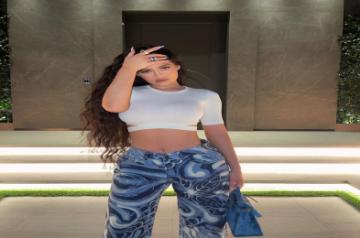 In a set of three images she posted on Instagram, Kylie is seen in a white cut-out crop top paired with blue prints. She has her long black hair open.
