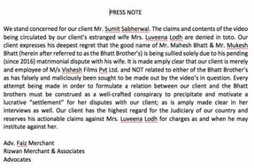 "Every attempt being made in order to formulate a relation between our client and the Bhatt brothers must be construed as a well-crafted conspiracy to precipitate and motivate a lucrative 'settlement' for her disputes with our client; as is amply made clear in her interviews as well. Out client has the highest regard for the judiciary of our country and reserves his actionable claims against Mrs Luviena Lodh for charges as and when he may institute against her."
