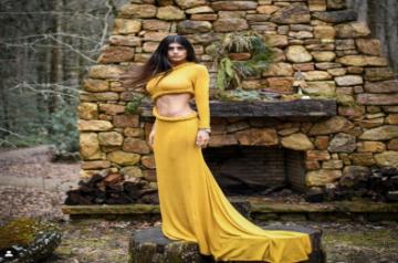 In the photo, Mia strikes a pose in a cut-out mustard-coloured dress in, flaunting her tiny waist. She stands against the backdrop of a forest.