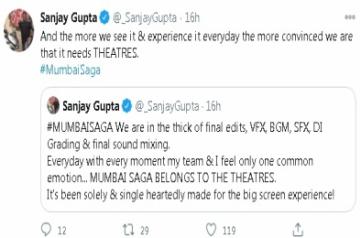 "#MUMBAISAGA: We are in the thick of final edits, VFX, BGM, SFX, DI Grading & final sound mixing. Everyday with every moment my team & I feel only one common emotion... MUMBAI SAGA BELONGS TO THE THEATRES. It's been solely & single heartedly made for the big screen experience," Gupta tweeted while sharing an update about the film.