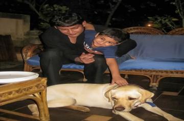 In the image, Mahesh holds Gautham while their son bends down to reach out for their pet dog.