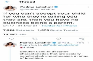 Los Angeles, April 1 (IANS) Indian American model, TV host, author and activist Padma Lakshmi took to her Twitter account to deliver a lecture to parents of transgender children, in a series of tweets. Lakshmi's tweets were against parents who don't accept the gender identity by their children.