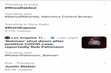Mumbai, Sep 4 (IANS) After a team of Narcotics Control Bureau (NCB) raided the home of actress Rhea and Showik Chakraborty, a hashtag on the subject was top trend on Twitter.