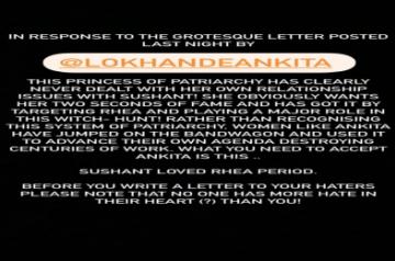"Such a grotesque letter by (Ankita). This princess of patriarchy who has never dealt with her own relationship issues with Sushant, clearly she wants her two seconds of fame and has capitalised on Rhea being targeted.