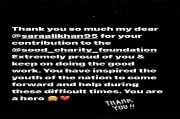 "Thank you so much my dear Sara Ali Khan for your contribution to the @soodfoundation! Extremely proud of you & keep on doing the good work. You have inspired the youth of the nation to come forward and help during these difficult times. You are a hero @sara_ali_khan95," he wrote on Twitter.