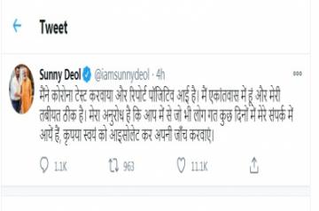 Sunny took to Twitter to share the news. He wrote in Hindi: "Maine corona test karwaya aur report positive aaya hai. Main ekantwaas mein hoon aur meri tabiyat theek hai. Mera anurodh hai ki aap mein se jo bhi log gat kuch dinon mein mere sampark mein aaye hain, kripya swaym ko isolate kar apni jaanch karwaye (I got myself tested for corona and my report is positive. I am in isolation and my health is fine. I request all those who came in contact with me recently to get yourself tested and stay in isolation)."