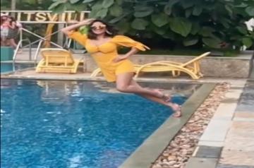 On Thursday, Sunny posted a slow-mo video on Instagram. In the clip, Sunny is seen dressed in a mustard jumpsuit and is posing for the camera as she slowly falls into the pool.