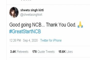 "Good going NCB... Thank You God. #GreatStartNCB," Shweta wrote on her Twitter handle.
