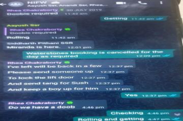 A screenshot from a WhatsApp chat on July 21, 2019, has Showik Chakraborty writing to the mobile owner: "reach soon guys. And also tell Aayush to get doobies."