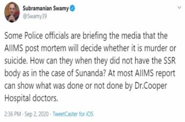 "Some Police officials are briefing the media that the AIIMS post mortem will decide whether it is murder or suicide. How can they when they did not have the SSR body as in the case of Sunanda (Sunanda Pushkar)? At most AIIMS report can show what was done or not done by Dr.Cooper Hospital doctors," he tweeted.