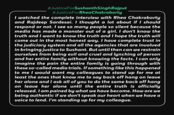 She wrote: "I watched the complete interview with Rhea Chakraborty and …. I thought a lot about if I should respond or not. I see so many people so silent because the media has made a monster out of a girl. I don't know the truth and I want to know the truth and I hope the truth will come out in the most honest way.