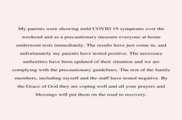 "The necessary authorities have been updated of their situation and we are complying with the precautionary guidelines. The rest of the family members, including myself and the staff have tested negative. By the Grace of God they are coping well and all your prayers and blessings will put them on the road to recovery," she added.