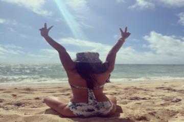 Kim posted a picture on Instagram, where she is seen flaunting her toned back in a floral bikini. The sun is adding an extra golden glow to the skin and the ocean can be seen in the backdrop.