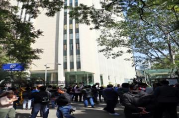 New Delhi: Media persons stand outside the office of BBC during a raid by the Income Tax authorities in New Delhi on Tuesday, Feb. 14, 2023. (Photo: Anupam Gautam/IANS)