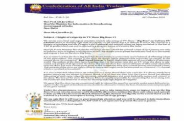 Mumbai, Oct 7 (IANS) The Confederation of All India Traders (CAIT) has sent a letter to the Information and Broadcasting Minister Prakash Javadekar urging him to impose a ban on the 13th season of the reality TV show "Bigg Boss" on grounds of vulgarity.
