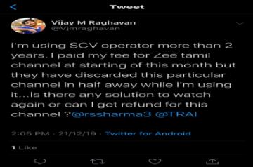 On December 21, one consumer tweeted: "I am using VK digital. Yesterday onwards @ZeeTamil Not coming."