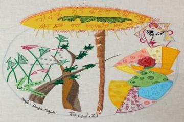 Through the words of Dr. Kalra, and through the medium of embroidery, I work towards the discovery of spiritual realism and the truthfulness of my soul. Shabads, with their full grace, have been lovingly sketched and embroidered in zardosi and chikankari. "