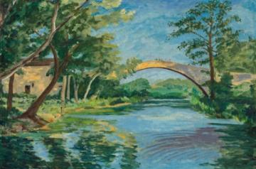 Trois Sautets, which translates as ‘three small jumps’, is an elegant bridge that arches over the River Arc. In the last year of his life, Cézanne produced two watercolours of the scene, Baigneuses sous un pont (New York, Metropolitan Museum of Art) and Le Pont des Trois Sautets (Cincinnati Art Museum). In 1948, Willy Sax and the Swiss artist Charles Montag visited Churchill in the South of France, where he painted The Bridge at Aix en Provence, one of two paintings of the subject he executed.