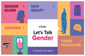 LetstalkGender.in discusses what the binary is, why it is restricting, the necessity and use of pronouns, and what a partner's queerness implies for someone dating them, as well as providing solutions to frequently asked concerns and curiosities. The microsite evolves into a lexicon of gender identities and descriptors based on lived experiences by members of the community as one navigates through it. These identities, as visible on the Tinder app, are made up of a variety of umbrella words, some of which are fluid, while others refer to a mix of gender identities.
