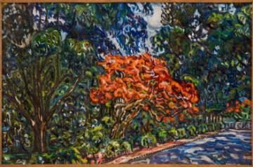 Rumale's canvases immortalise the vibrant hues of Bengaluru's Jacarandas, African Tulips, Gulmohars, Bougainvillea, et al.