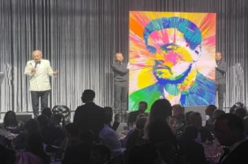 At around midnight, the charity devoted to raising money for AIDS research unveiled a one-of-a-kind portrait of DiCaprio. Two men rolled the large canvas of art onstage, as if they were handling the Mona Lisa. This was not a gag -- it was, in fact, actually valuable, notes 'Variety'.