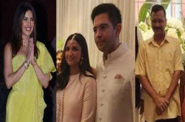 Before she arrived, Chadha's seniors in the Rajya Sabha, both representing West Bengal in the Upper House -- ace Supreme Court advocate and Congress spokesperson Abhishek Manu Singhvi with wife, ghazal and Sufi singer Anita Singhvi, and eloquent TMC MP, and former quizmaster Derek O'Brien, also with wife, Dr Tonuca Basu -- walked in and happily posed for the photographers. Singhvi even showed the paper bag in which he was carrying a gift for the couple.