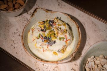 A luscious blend of strained yogurt, saffron, and cardamom served in nutty granola cups, topped with a medley of fresh fruits and crunchy nuts.