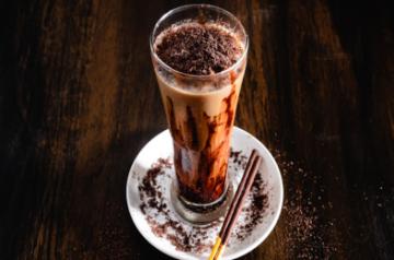 - Blend together milk, espresso, and vanilla ice cream in a Hamilton blender for 30-40 sec. until smooth. Take a pilsner glass, Glaze the glass with HCF to add flavor, and pour the mixture into it Garnish with Chocolate chips