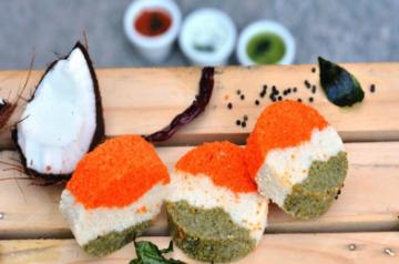 Place red colour batter in a round mould followed by white then green at the last. Steam in the oven for 20 minutes or till it is done. Serve with tomato chutney, coconut chutney and green coriander chutney.