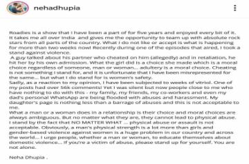 Responding to the trolls, Neha wrote: "Roadies is a show that I have been a part of for five years and enjoyed every bit of it. It takes me all over India and gives me the opportunity to team up with absolute rock stars from all parts of the country. What I do not like or accept is what is happening for more than two weeks now! Recently during one of the episodes that aired, I took a stand against violence.