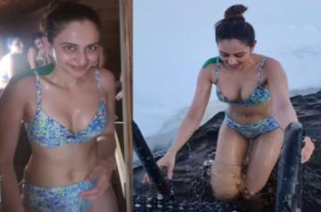 In the clip, Rakul is seen wearing a blue bikini as she runs from her cabin located in the middle of snowy locale and then takes a dip in icy cold water.