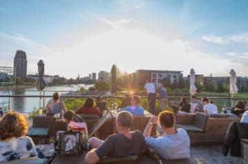 As you move east from downtown, the skyline becomes more and more compact and offers a dreamlike setting for unforgettable sunsets. The roof terrace of the restaurant Oosten in the Ostend near the European Central Bank is a perfect place to enjoy with a cool drink in your hand.
